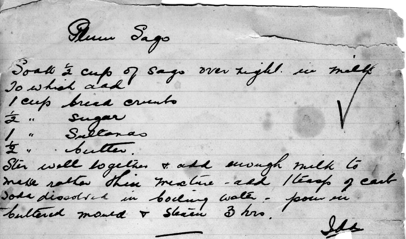 These recipes reflect a time when the sharing of recipes between women was a social institution. Asking for a recipe was a mark of deference to a host over afternoon tea or during a meal.